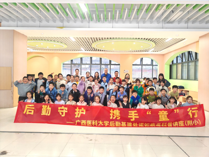 为切实防范诺如病毒、守护师生健康,12月12日下午,后勤基建处走进广西医科大学附属小学,开展了一场别开生面的诺如病毒防控科普活动。本次活动由医疗卫生管理科科长陈雯玲同志主讲,她以生动有趣的形式,为孩子们普及科学实用的防护知识,搭建起“大手拉小手”的健康防护网。